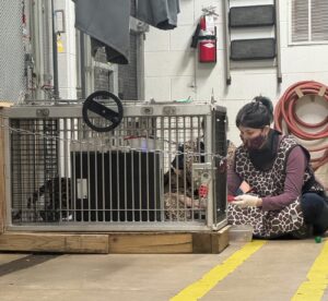 This is where all of Rio’s training became incredibly valuable. Previously we had worked on training her to receive ultrasounds, but we quickly learned that Rio’s temperament did not align with that behavior. She’s shy, and did not appreciate being touched. When training wild animals, it’s incredibly important to go with what they give you so that everyone can succeed. We made the decision to pivot to x-rays, which were a lot less invasive. Rio had already been trained to get into what is called a squeeze crate, so adding on to that behavior was a lot easier for her. A few days after noticing these changes, we were able to obtain x-rays on Rio that just barely showed a bun in the oven!