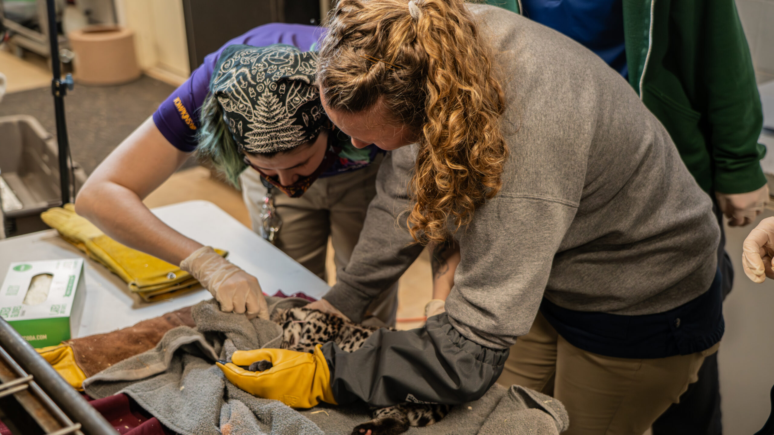 Once Rio had given birth, we immediately put the building on “quiet protocol,” which for all intents and purposes was a lockdown of the area. Essential staff only, minimal activity, the works. Cats are flighty and easily disturbed with their young, and Rio was also a first time mom. We had to make sure that Rio felt secure in her den space, as it’s not uncommon for a mother to abandon her kitten if she feels unsafe. The first few days in particular are the most delicate for mother and kitten. During that time, keepers monitored the cameras 24 hours a day, taking late night shifts to ensure we were seeing proper maternal signs such as nursing, grooming, and an overall calm demeanor.